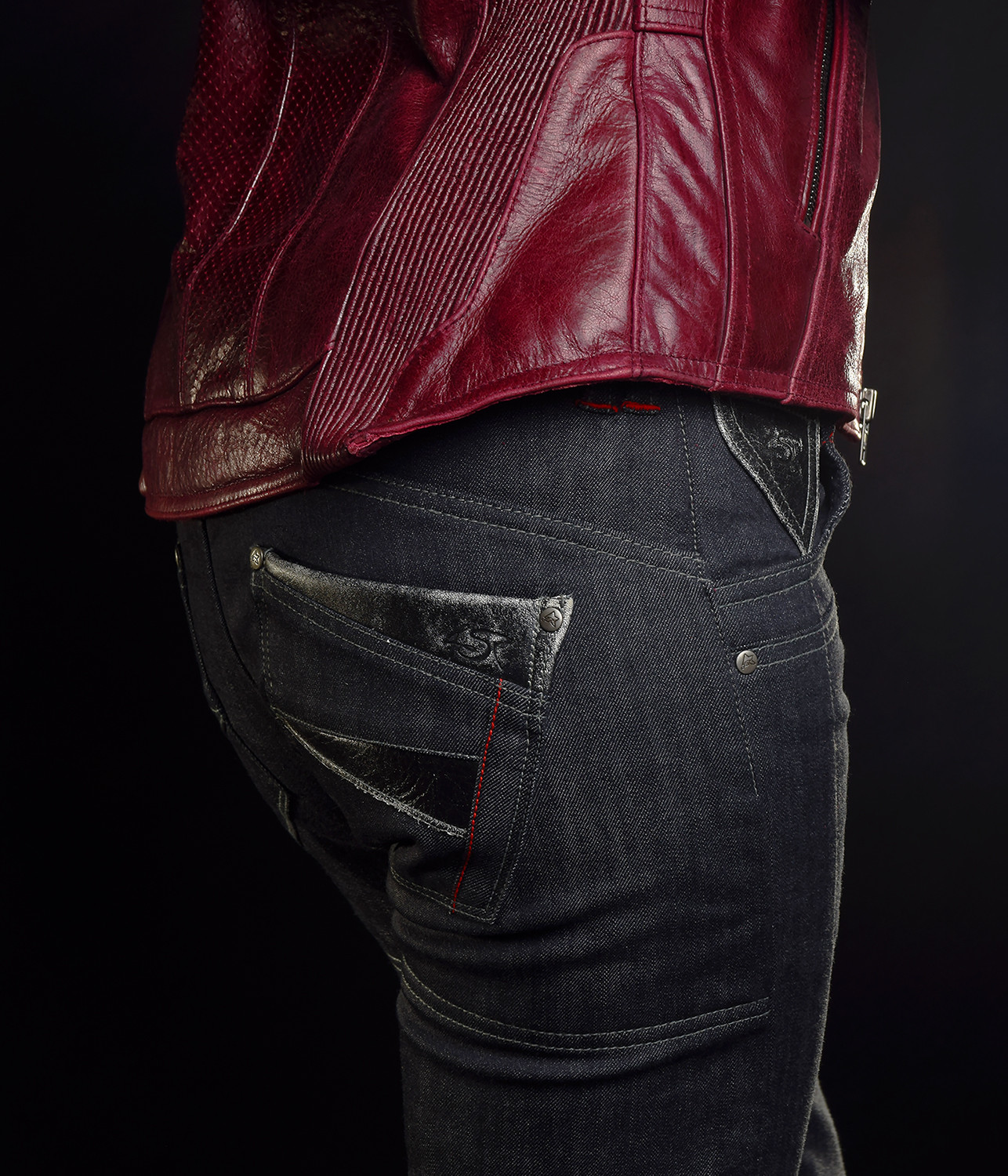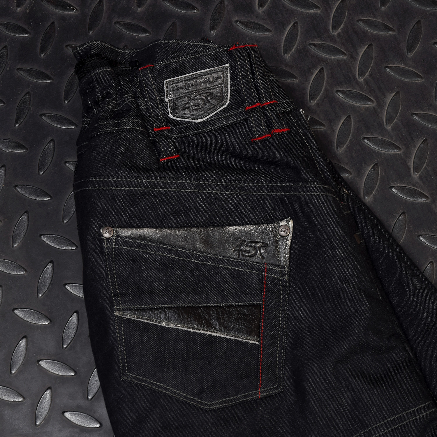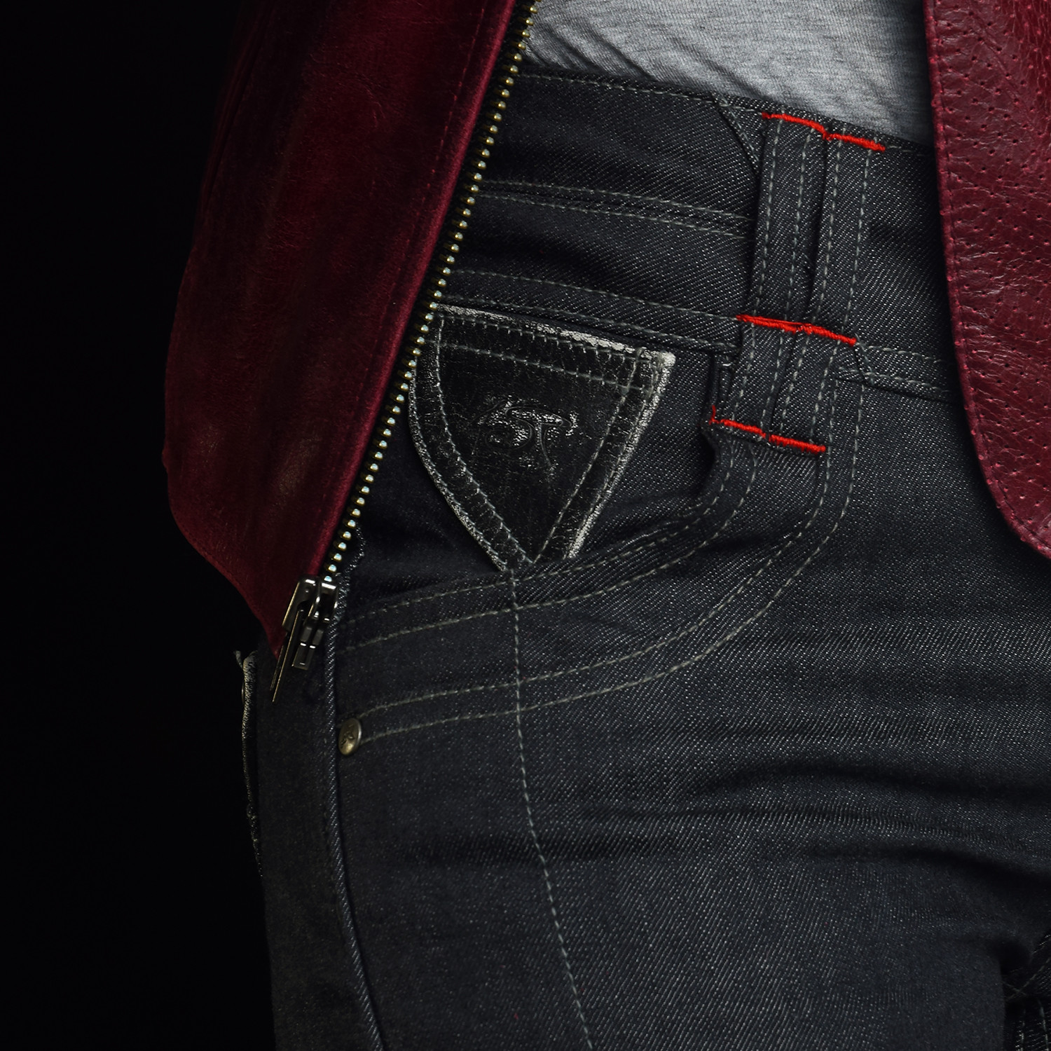 Motorifle od 4SR For Street Racing sú vyrobené z čierneho 14 uncového denimu, ktorý je vďaka pridanému elastanu dostatočne pružný a pohodlný. V oblasti kolien a sedacej časti sú vystužené originálnym vláknom DuPont™ Kevlar®